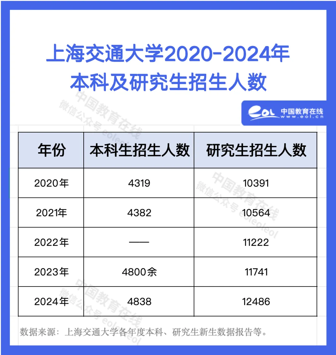上海交通大學自2020年至今,本科生招生人數均在4000多人,而研究生招生則一直在萬人以上,2024年達12486人。近五年來,其研究生招生數一直在本科招生數的兩倍以上。