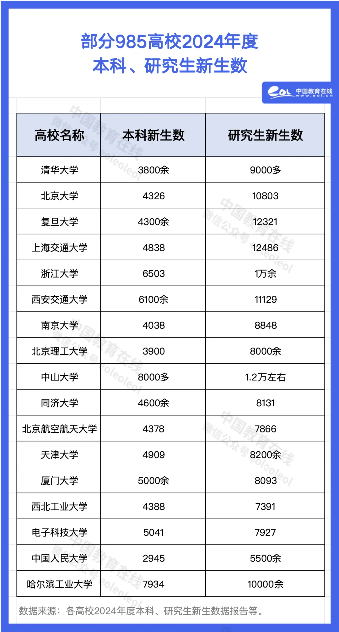 從2024年招生數據來看,絕大多數985高校的研究生招生人數均超過本科生,其中“清北復交”等頭部高校,研究生招生人數均為本科生的兩倍以上,多所985研究生新生規模已破萬。