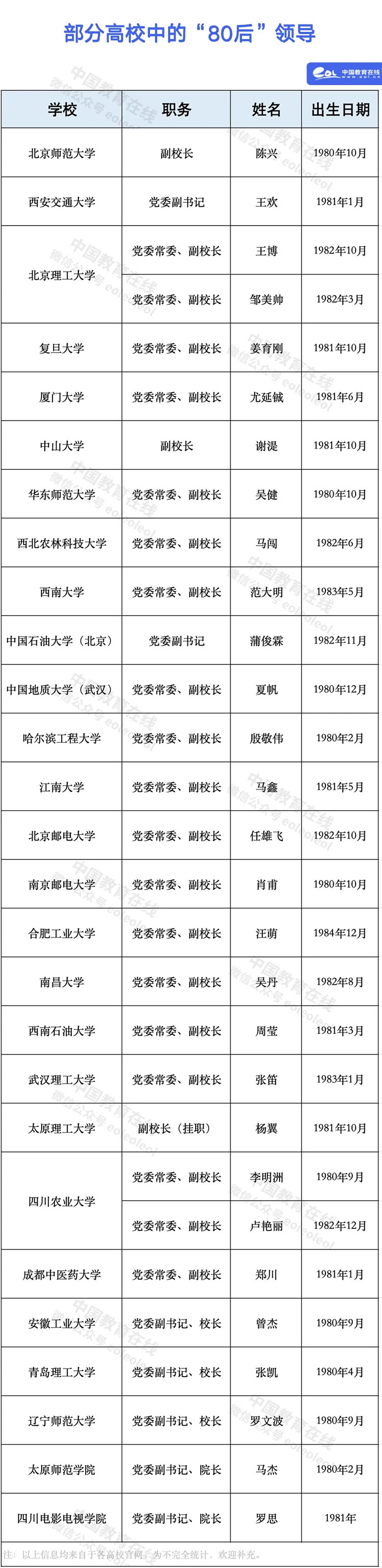 4、目前公開報道的80后高校領導,副職居多,雙一流高校及頂尖高校,尚無80后正職校長。