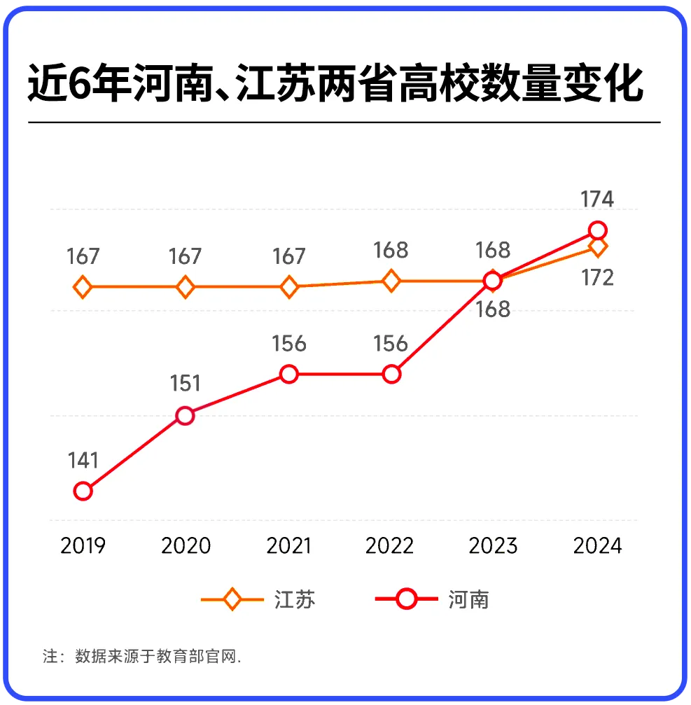 近年來,隨著一批批新大學的設立,全國高校數量分布也在發生變化。據教育部官網2024年6月21日發布的《全國高校學校名單》顯示,截至2024年6月20日,河南高校數量達到174所,超越江蘇(172所),正式晉級全國“高校數量第一省”。