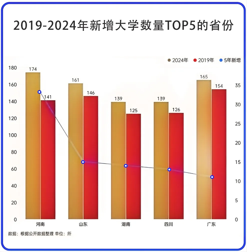 據教育部公布的統計數據,2019年,河南的高校數量為141所,短短5年間,大幅增加到174所,猛增33所,平均每年新增6.6所大學,增長速度驚人。