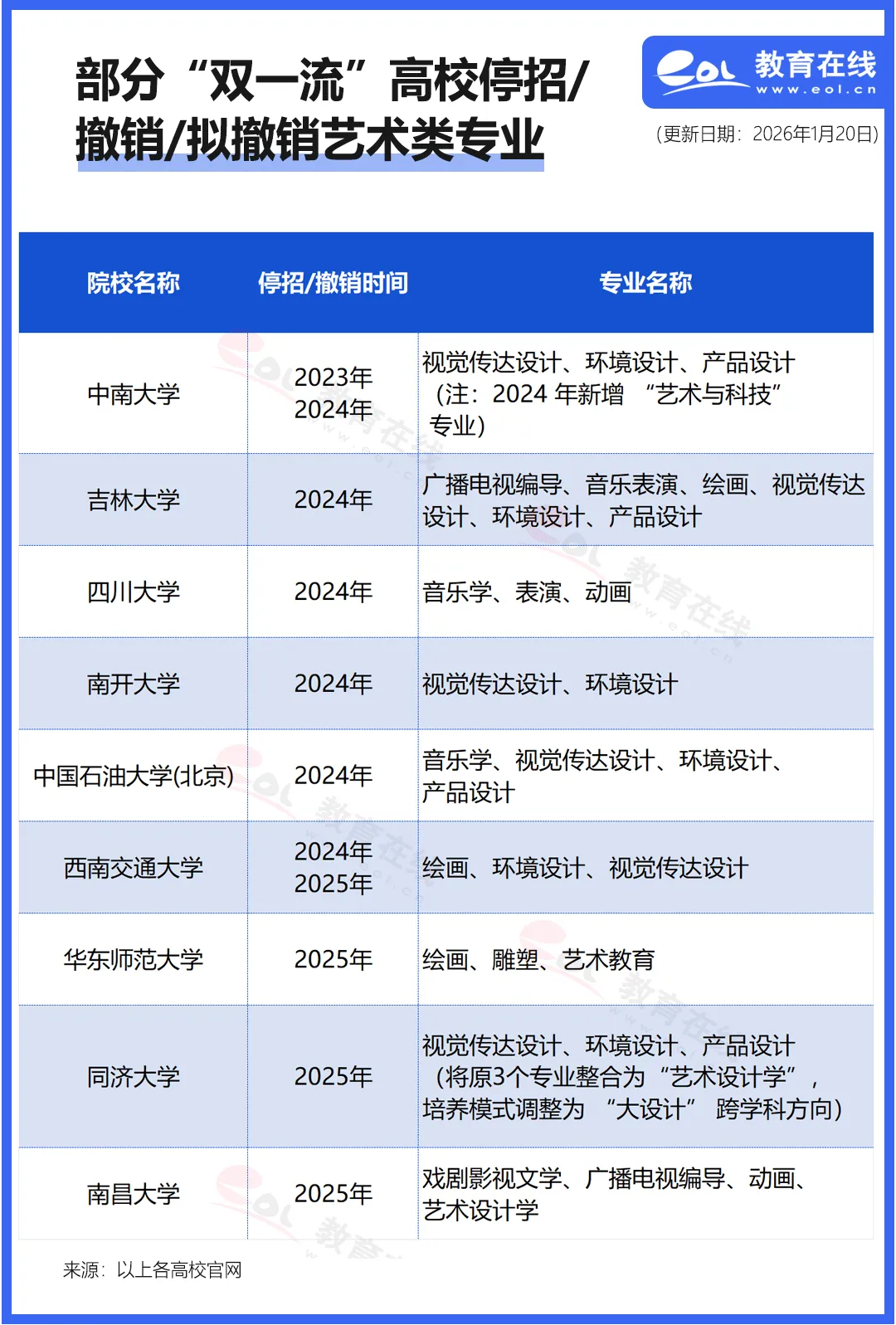 近日,吉林大學本科生院更新的本科專業目錄引發關注:該校141個本科專業中19個已停招,其中6個為藝術學類專業——廣播電視編導、音樂表演、作曲與作曲技術理論、產品設計、環境設計、視覺傳達設計,且均在2024年停招。