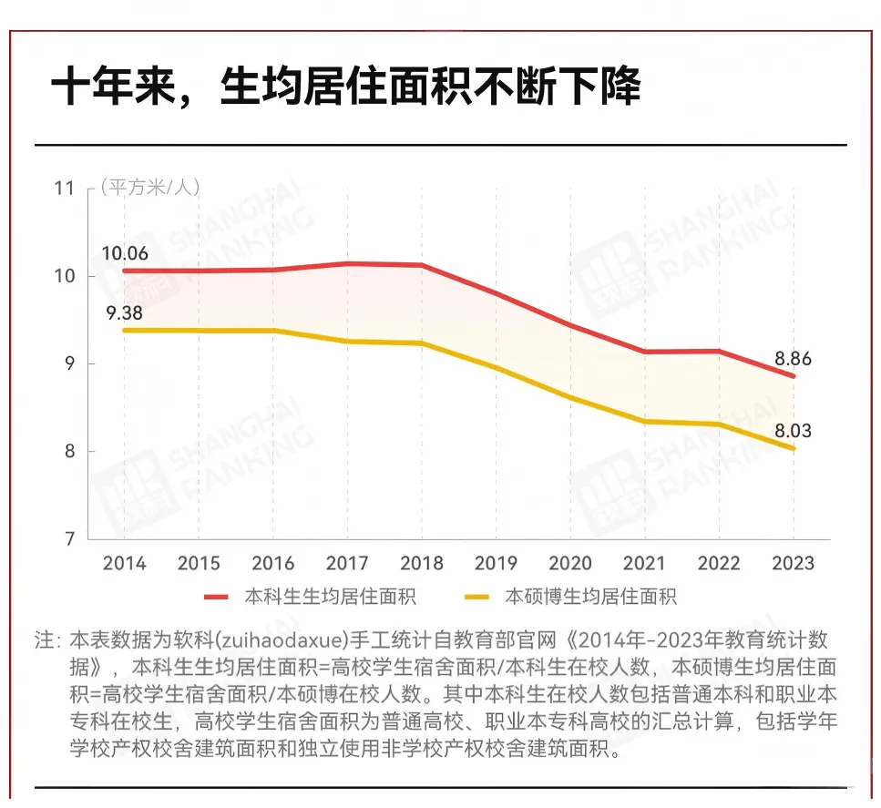 這不是個例。盡管由教育部組織編制的《普通高等學校建筑面積指標》明確要求本科生、研究生、博士生校舍建筑面積分別為10㎡/生、15㎡/生、20㎡/生(含公攤),但現實是,全國生均居住面積不僅沒有達標,近幾年甚至還在一路下降。