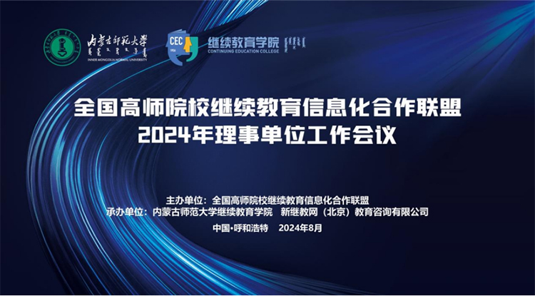 8月21日-8月23日,由全國高師院校繼續教育信息化合作聯盟主辦、內蒙古師范大學繼續教育學院與新繼教網(北京)教育咨詢有限公司承辦的全國高師院校繼續教育信息化合作聯盟2024年理事單位工作會議在內蒙古師范大學召開。教育部職業教育與成人教育司高等繼續教育處副處長徐璐、北京師范大學教授、全國高校現代遠程教育協作組常務秘書長李德芳、內蒙古師范大學副校長賈美林以及來自哈爾濱師范大學、廣西師范大學、河南師范大學、四川師范大學、云南師范大學、安徽師范大學、河北師范大學、江西師范大學、東北師范大學等高校和聯盟秘書處新繼教網共80多位代表參加會議,會議由內蒙古師范大學繼續教育學院黨總支書記袁常軍主持。