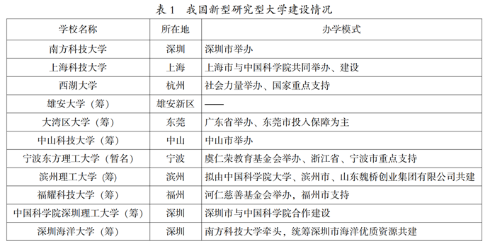 當前,從體量上看,我國已成為高等教育大國,而且正在向強國邁進。特別是從20世紀90年代開始,國家先后實施“211工程”“985工程”,提出建設“世界一流大學”“世界一流學科”的目標,在普及化大發展的同時,下大力氣提高高等教育質量,促進內涵式發展,在各大世界大學排名中,中國大學的位次都有明顯提升,也側面反映出中國大學的快速發展和進步。尤其過去10余年間,以南方科技大學、西湖大學等為代表的新型研究型大學快速興起,除此在我國東南沿海等經濟相對發達地區還有多所定位于高水平、研究型的新型大學陸續謀劃籌建(見表1),在全球范圍內整合優質資源,引進高端人才,站在科技前沿,努力在短時間內形成沖擊世界一流的核心競爭力。例如,在《自然》雜志發布的2021年度年輕大學自然指數中,南方科技大學排在第2位,西湖大學成為上升最快的25所年輕大學中最年輕的一所,為我國高等教育高質量發展開辟了新賽道。