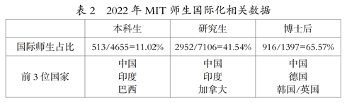 世界一流大學還都特別重視人才培養的國際化,普遍制定和實施全方位的國際化戰略,包括吸引和擴大國外優秀師資和國際學生比例,建立跨文化課程體系,參與國際問題研究,加強與國外大學、研究機構及社會組織的合作交流等,以高水平的國際化項目和師資帶動學生認識并了解世界,接觸不同的群體并理解其文化。例如,麻省理工學院有來自全世界135個國家的國際學生,研究生和博士后中國際人員比例分別超過總人數的40%和65%(見表2)[5],43%的教師出生在美國境外;2022—2023年耶魯大學有來自全球130個國家的3073位國際學者[6];普林斯頓大學自2009年起發起“橋年計劃”(Bridge Year),選取部分大一新生參加為期9個月的國際交流項目;斯坦福大學的課程內容涉及全世界各地區的文化,如“當代全球事件的歷史和地理背景”“德國和世界大戰”“拉丁美洲的文化、政治和社會”“現代中國史”等等[7],同時在斯坦福亞太研究中心,斯坦福大學的研究人員與來自美國與亞洲的研究人員合作開展涵蓋亞洲地區廣泛議題的國際合作研究。