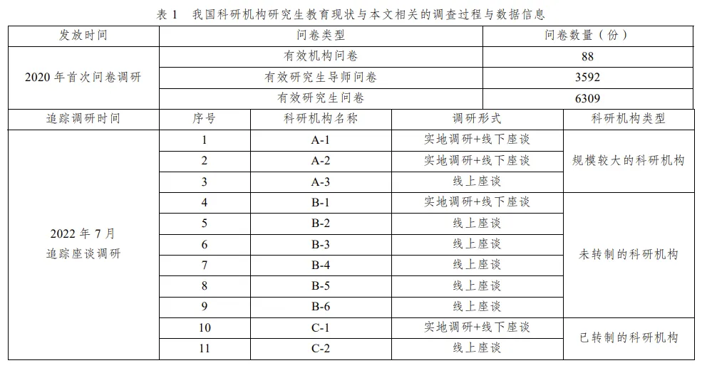 2020 年首次調研基本覆蓋全國航空航天、核工業、信息、兵器、環境、建筑、規劃、設計、地質、農業、林業、水利、醫療、經濟、貿易、金融、黨校等各類科研機構。回收科研院所問卷 88 份;回收研究生導師問卷 3755 份,有效問卷為 3592 份;回收研究生問卷 6713 份,有效問卷 6309 份。2022 年課題組在首次調查的基礎上,以科研機構是否轉制以及規模大小為標準,重點挑選了總部位于北京地區的 11 個有代表性的科研機構,通過線上問卷以及線上線下座談的方式進行二次深度調研,這 11 所科研機構包括 6 所未轉制的、2 所已轉制的、3 所規模較大的機構。之所以調研研究生教育規模較大的科研機構,主要是因為規模小的科研機構的研究生教育都是通過與高校聯合培養來滿足課程教學要求,模式較為單一,而規模大的科研機構有能力進行課程教學等活動,其管理模式和與高校的合作關系更加多樣化。
