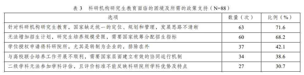 20世紀90年代,國家為適應經濟體制改革,同時進行管理體制和科技體制的改革,部署完成了242家科研院所(其中有不少是研究生培養單位)的轉制工作。由于國家機構的調整,一批行業主管部委被撤銷或向企業集團轉制,轉制為企業的科研機構面臨無法保留研究生教育相關學科和學位點的困境。部分科研機構失去了主管政府部門,由于科研機構研究生教育的辦學資金多為部委下撥或者自籌,因此這些科研機構研究生教育在計劃協調、發展規模、經費支持、指導管理等方面受到很大影響。除了專項工作(如招生、畢業分配)之外,已轉制的科研機構與國家各級教育主管部門溝通協調能力較弱,無法接收到教育行政部門下發的相應政策文件以及日常管理要求等,致使自身無法及時把握國家政策動向,缺乏對國內外研究生教育形勢的正確認知,例如,不少科研機構甚至不了解當前我國正在大力推進專業學位碩士、博士研究生教育這一情況。表3展示了科研機構認為自身研究生教育面臨的困境及所需的政策支持。