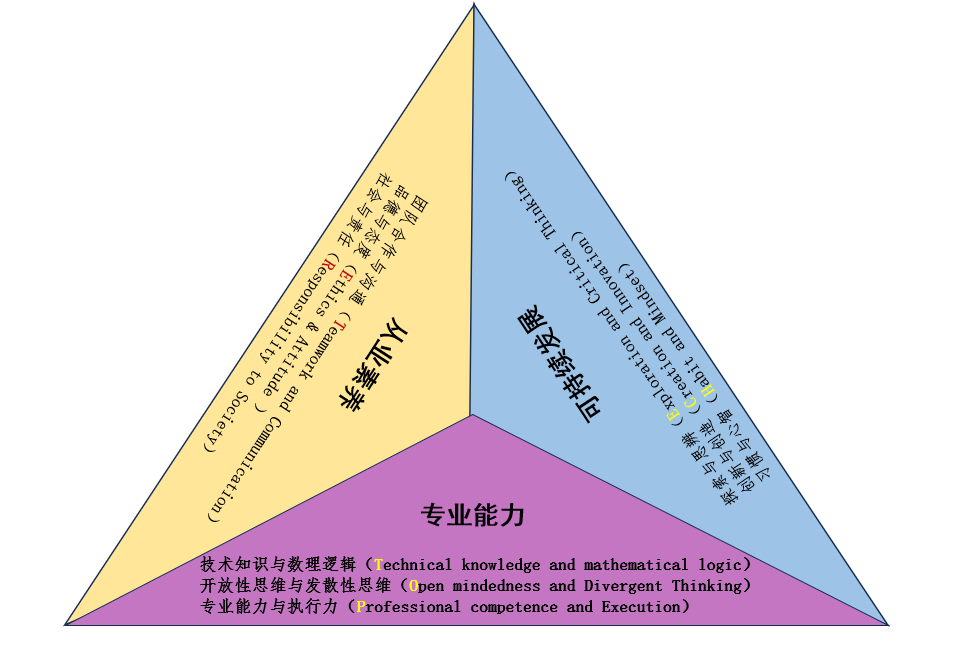 信息文明時代,我們應該構建了專業能力、從業素養和可持續發展“三棱錐”圖譜,圍繞知識探索、能力建設、人格塑造三要素構建“TOPTECHER”核心能力模型。“三棱錐”中的專業能力主要包含以下三個指標:技術知識與數理邏輯(Technical knowledge and mathematical logic),開放性思維與發散性思維(Open mindedness and Divergent Thinking),專業能力與執行力(Professional Competence and Execution);在從業素養中,我們應該更加強調了學生與社會的溝通能力以及對社會的責任,從業素養包含了以下三個指標:團隊合作和溝通(Teamwork and Communication),品德與態度(Ethics and Attitude),社會與責任(Responsibility to society);可持續發展能力包含了以下三個指標:探索與思辨(Exploration and Critic thinking), 創新與創造(Creation and Innovation),習慣與心智(Habit and Mindset)。在“三棱錐”模型中,專業能力為基礎,筑牢事業發展的根基,從業素養為保障,規范職業行為的準則,可持續發展是關鍵,開啟未來職場的通途。三者相互促進,相互影響,共同推動高等教育供給側從“學業”認同向“就業”認同轉變,從“學歷”認同向“能力”認同轉變,從“成長”認同向“成才”認同轉變。