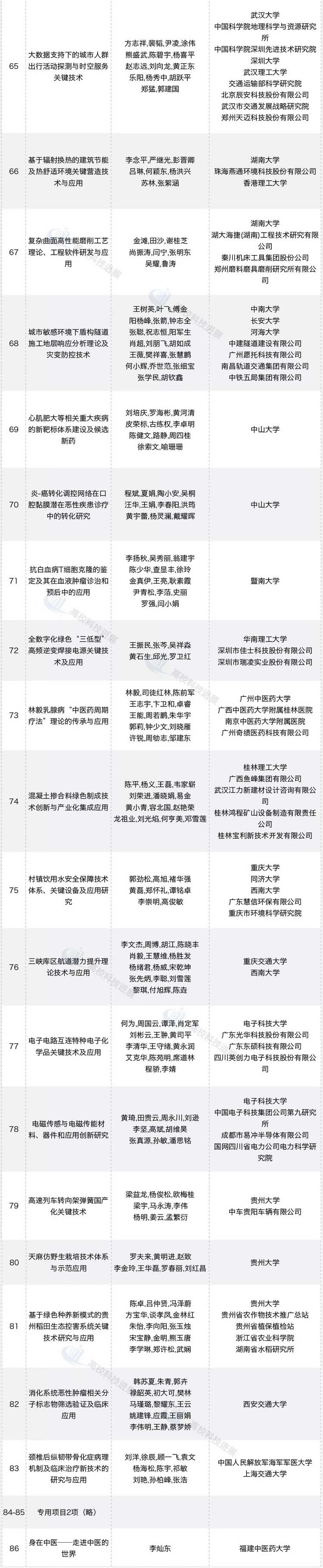 本次全部授獎項目共315項(人),其中,特等獎1項、一等獎116項。在全部授獎項目中,自然科學獎120項,技術發明獎49項,科學進步獎136項,青年科學獎10人。