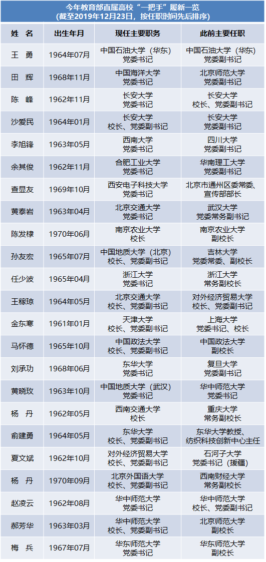 記者梳理教育部網站信息發現,2019年至今已有至少19所教育部直屬高校“一把手”調整,12位黨委書記、11位校長走上了新的工作崗位。其中,長安大學、北京交通大學、東華大學和華中師范大學四所高校的黨委書記、校長今年雙雙調整。(具體情況見下表)