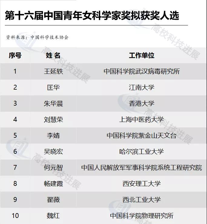 據中國科學技術協會官網日前對外公示的第十六屆中國青年女科學家獎、2019年度未來女科學家計劃擬獲獎名單顯示,本次共有9位高校女科學家,3個高校女科學家作為負責人的團隊入圍擬獲獎名單。