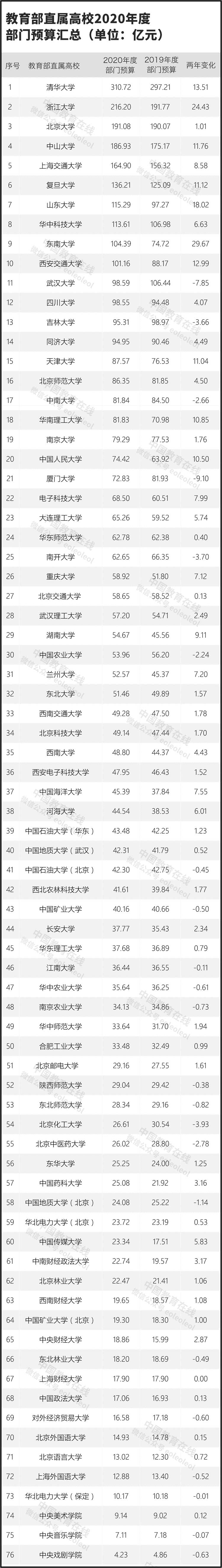 以下為教育部直屬高校2020年預算匯總及與2019年預算的對比: