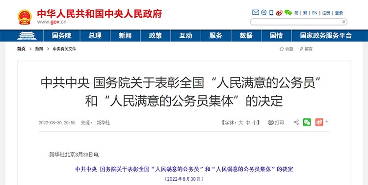 8月30日,中共中央 國務院發布關于表彰全國“人民滿意的公務員”和“人民滿意的公務員集體”的決定。