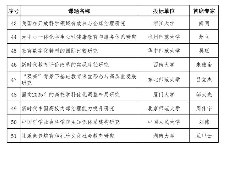 2022年度教育部哲學社會科學研究重大課題攻關項目按照《教育部哲學社會科學研究重大課題攻關項目管理辦法》相關規定,經組織專家評審,共有51個課題通過評審。現將評審結果面向社會公示,公示期為:2022年12月13日-12月19日。