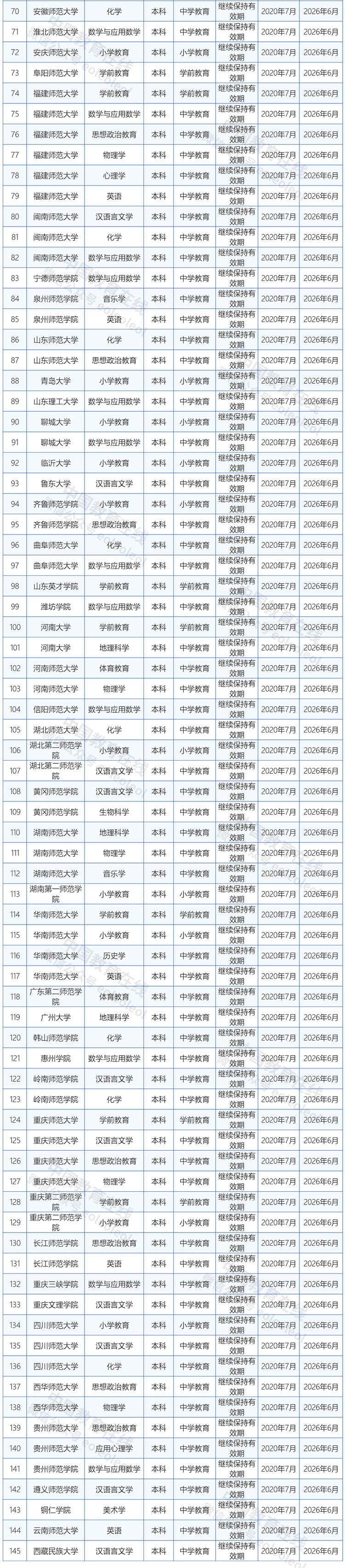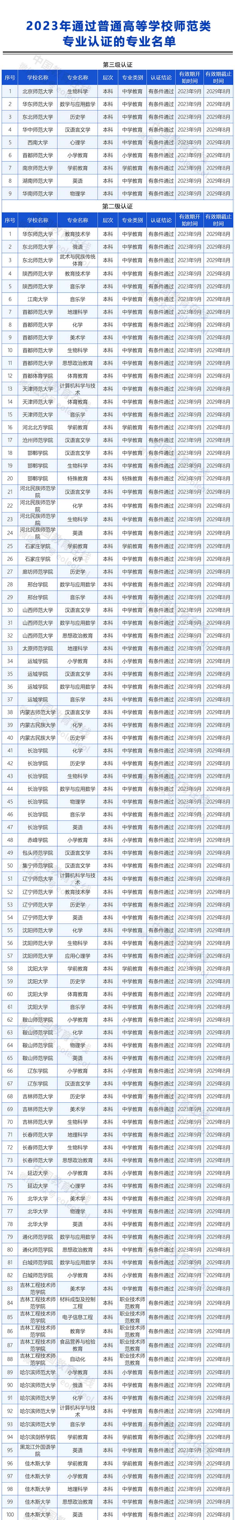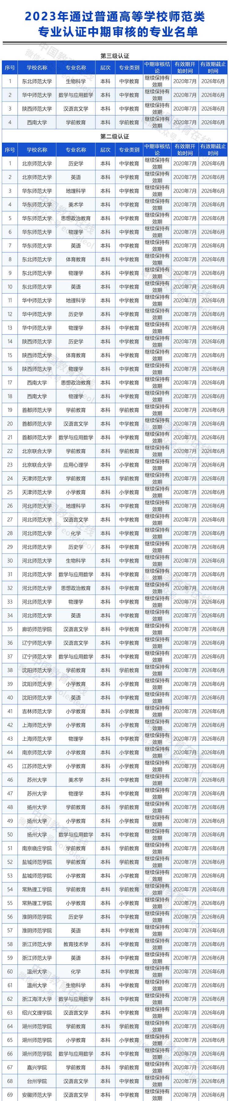 經高校提交整改材料、專家審查、普通高等學校師范類專業認證專家委員會審定,東北師范大學生物科學專業等149個認證有效期為“2020年7月至2026年6月”的專業通過了師范類專業認證中期審核,繼續保持原認證有效期至2026年6月。