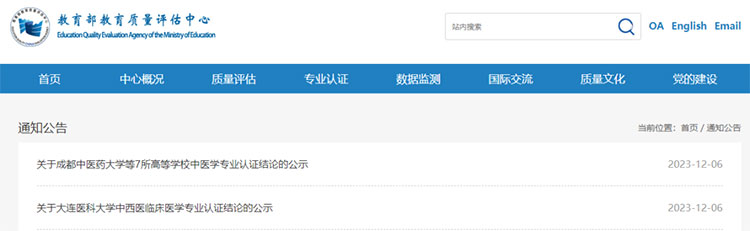教育部教育質量評估中心會同教育部高等學校中醫學類專業教學指導委員會(以下簡稱“中醫教指委”)對成都中醫藥大學等7所高等學校開展了中醫學專業認證。按照《普通高等學校醫學教育專業認證工作規程(試行)》有關要求,現將認證結論進行公示,公示時間自2023年12月6日起至12月12日止。