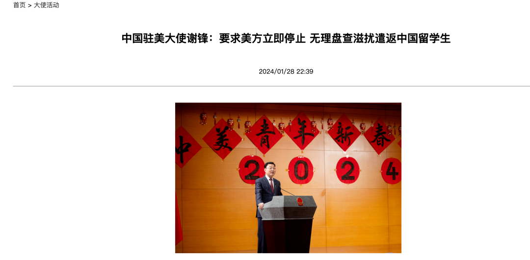 中國駐美國大使館高度重視維護中國留學人員安全和合法權益,已就此向美方提出嚴正交涉。美方頻繁對中國留學人員無端盤查甚至遣返,嚴重損害中國公民正當合法權益,與中美元首舊金山會晤關于促進兩國人文交流的共識背道而馳。我們強烈敦促美方停止錯誤做法,停止無端滋擾、盤查、遣返中方留學人員,切實將兩國元首關于支持中美人文交流,鼓勵擴大留學生規模的共識落到實處。