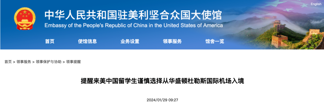 我使館提醒赴美中國留學生謹慎選擇從華盛頓杜勒斯國際機場入境