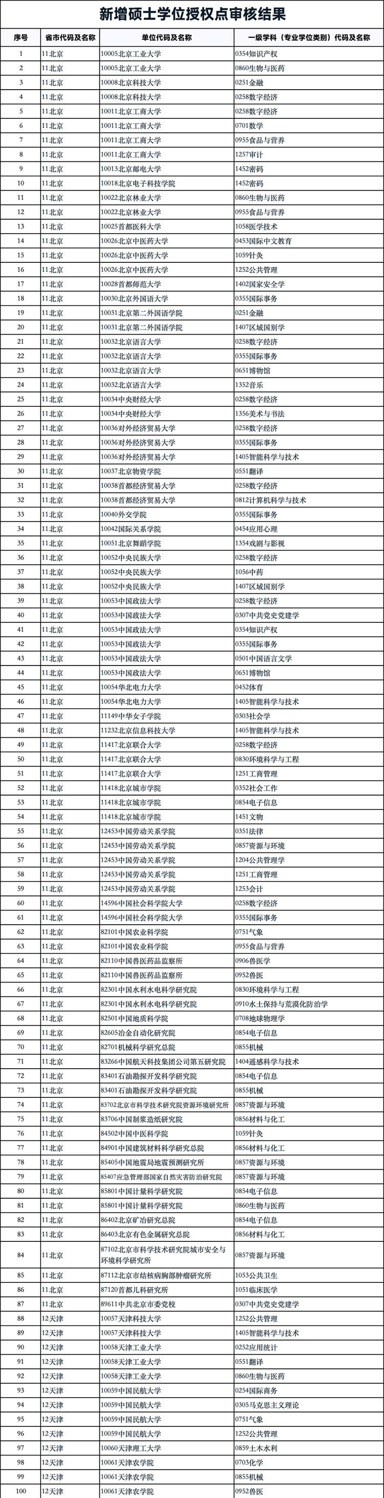 公示結果顯示,新增6個學位授權自主審核單位;新增博士學位授予單位中,獲2/3及以上同意票的申請單位共46個,2/3以下的申請單位共14個;新增碩士學位授予單位中,獲2/3及以上同意票的申請單位共63個,2/3以下的申請單位共22個;新增831個博士學位授權點,1924個碩士學位授權點。