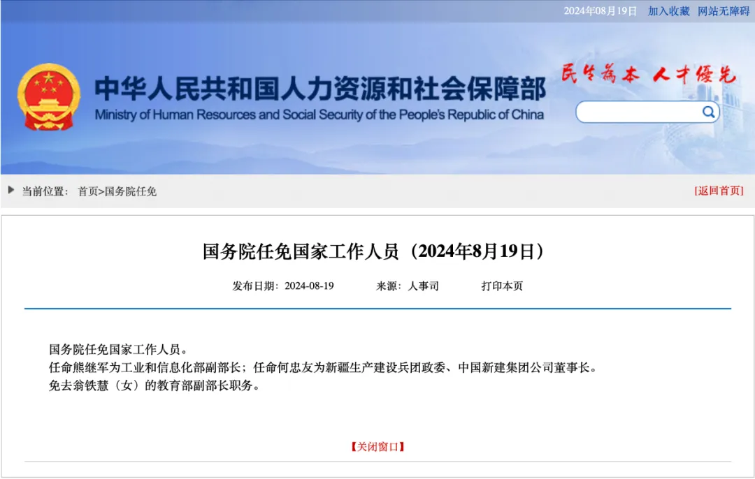據人力資源和社會保障部網站8月19日消息,國務院任免國家工作人員: