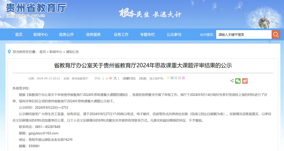 近日,貴州省教育廳組織專家對各高校上報的2024年思政課重大課題材料進行了評審,現將評審結果予以公示。公示時間為2024年9月23日—27日。
