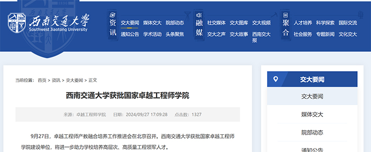 27日,西南交通大學官網發布消息稱,9月27日,卓越工程師產教融合培養工作推進會在北京召開。西南交通大學獲批國家卓越工程師學院建設單位,將進一步助力學校培養高層次、高質量工程領軍人才。