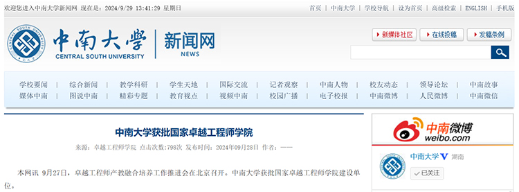 28日,中南大學官網發布消息稱:9月27日,卓越工程師產教融合培養工作推進會在北京召開。中南大學獲批國家卓越工程師學院建設單位。