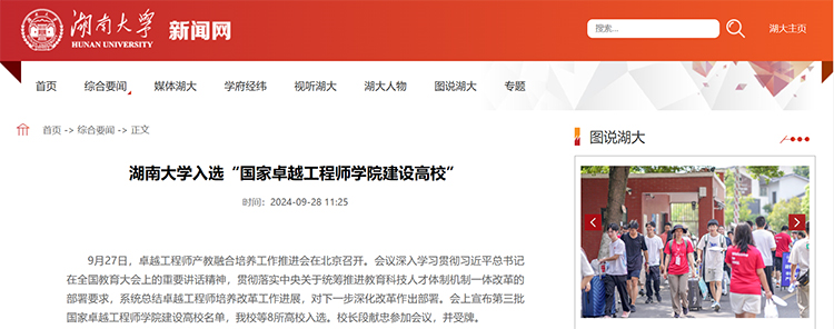 2023年,湖南大學卓越工程師學院成立。學院緊扣國家戰略需求和行業產業一線需要,聚焦智慧能源、人工智能、新一代信息通信技術、智能建造、先進制造與高端裝備、新材料、生物醫藥等優勢學科與特色方向,攜手國機集團、懷柔國家實驗室、中國船舶、兵器工業集團、中國電科、南方電網等頭部企業及科研單位,穩步推進工程碩博士培養改革試點任務。