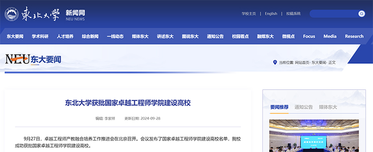 28日,東北大學官網發布消息稱,9月27日,卓越工程師產教融合培養工作推進會在北京召開。會議發布了國家卓越工程師學院建設高校名單,東北大學成功獲批國家卓越工程師學院建設高校。