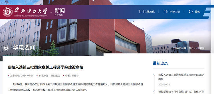 28日,華北電力大學官網發布消息稱,9月26日,教育部辦公廳發布《關于開展第三批國家卓越工程師學院建設工作的通知》,學校成功入選第三批國家卓越工程師學院建設高校,標志著學校在卓越工程師培養道路上進入新階段。