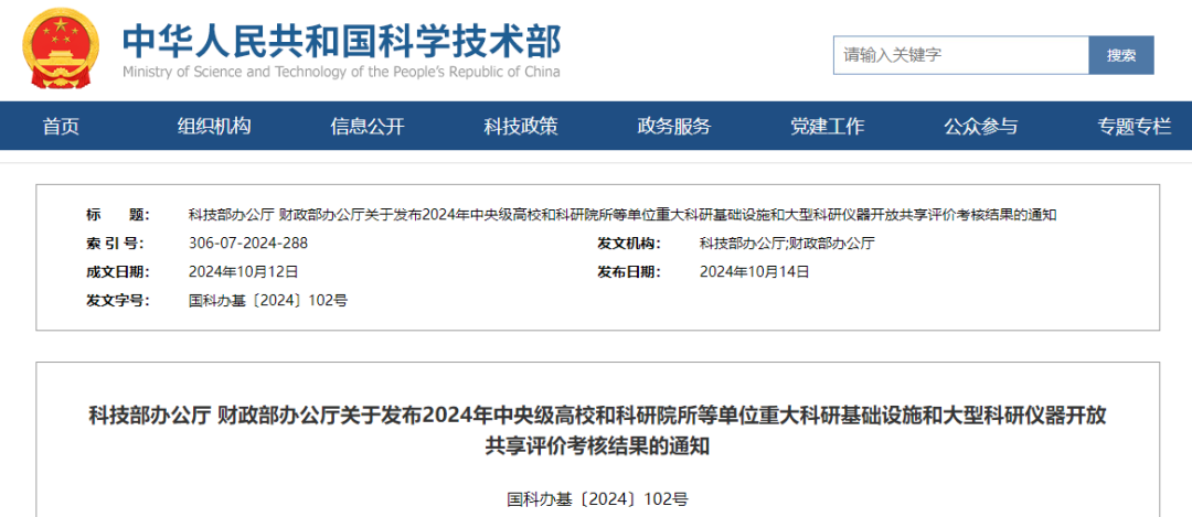10月14日,科技部辦公廳、財政部辦公廳發布了《關于發布2024年中央級高校和科研院所等單位重大科研基礎設施和大型科研儀器開放共享評價考核結果的通知》。