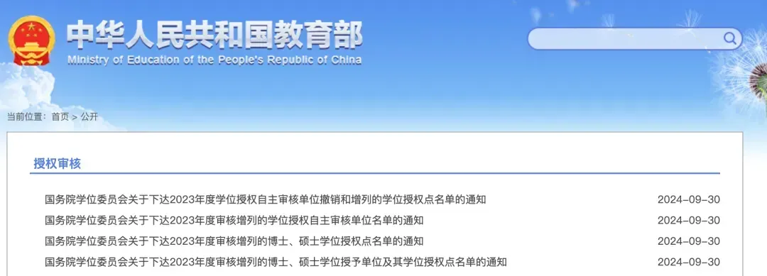 近日,教育部官網公開國務院學位委員會關于下達2023年度學位授權自主審核單位撤銷和增列的學位授權點名單和2023年度審核增列的學位授權自主審核單位名單的通知。