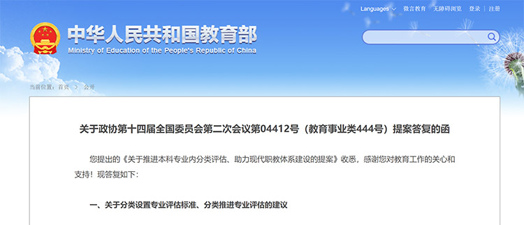 近日,教育部網站發布“關于政協第十四屆全國委員會第二次會議第04412號(教育事業類444號)提案答復的函”,就“關于推進本科專業內分類評估、助力現代職教體系建設的提案”作出答復。