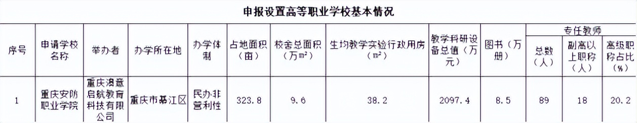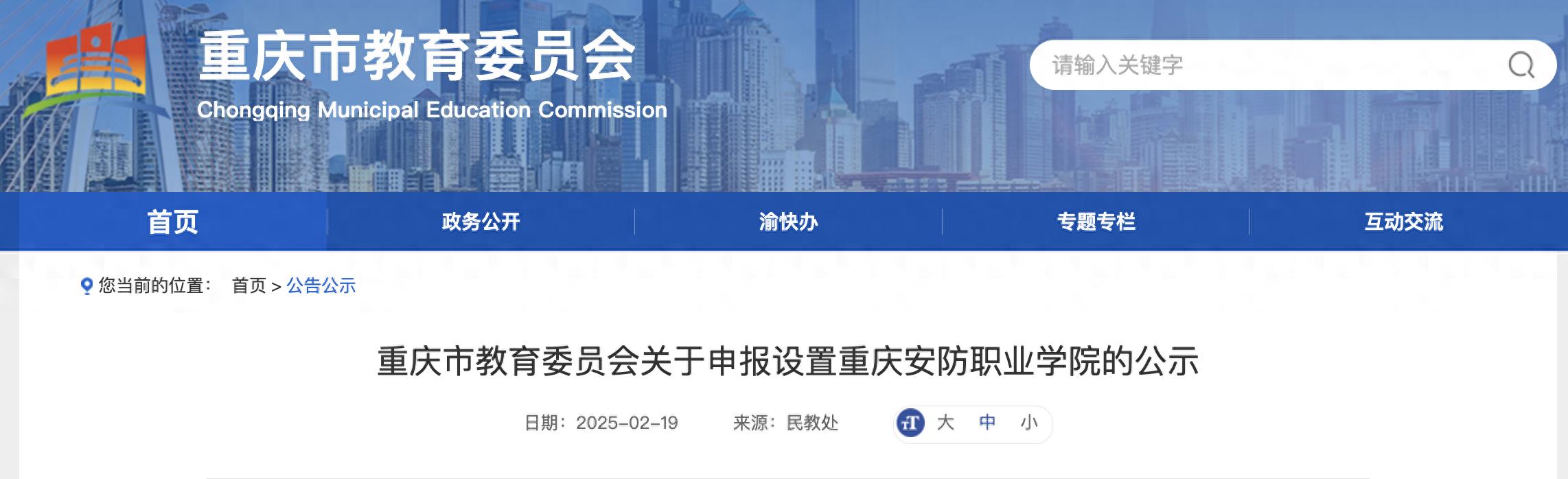 2月19日,重慶市教育委員會發布關于申報設置重慶安防職業學院的公示。部分內容如下: