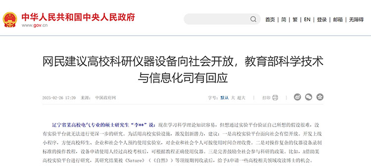 近日,有網友在中國政府網上留言,建議高校實驗平臺和科研儀器設備向社會開放。2月26日,教育部科學技術與信息化司回復稱,教育部歷來高度重視推動高校重大科研基礎設施和大型科研儀器設備全面開放、充分共享。目前,31個省(自治區、直轄市)342家中央級高校和科研院所建立了在線服務平臺并按照統一的標準規范與重大科研基礎設施和大型科研儀器國家網絡管理平臺互聯對接,14.1萬臺(套)原值50萬元及以上的大型科研儀器已納入平臺開放共享。