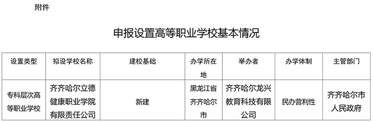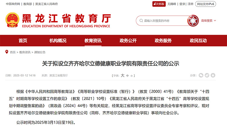 3月12日,黑龍江省教育廳發布《關于擬設立齊齊哈爾立德健康職業學院有限責任公司的公示》,對擬設置齊齊哈爾立德健康職業學院有限責任公司(簡稱,齊齊哈爾立德健康職業學院)事項向社會公示。