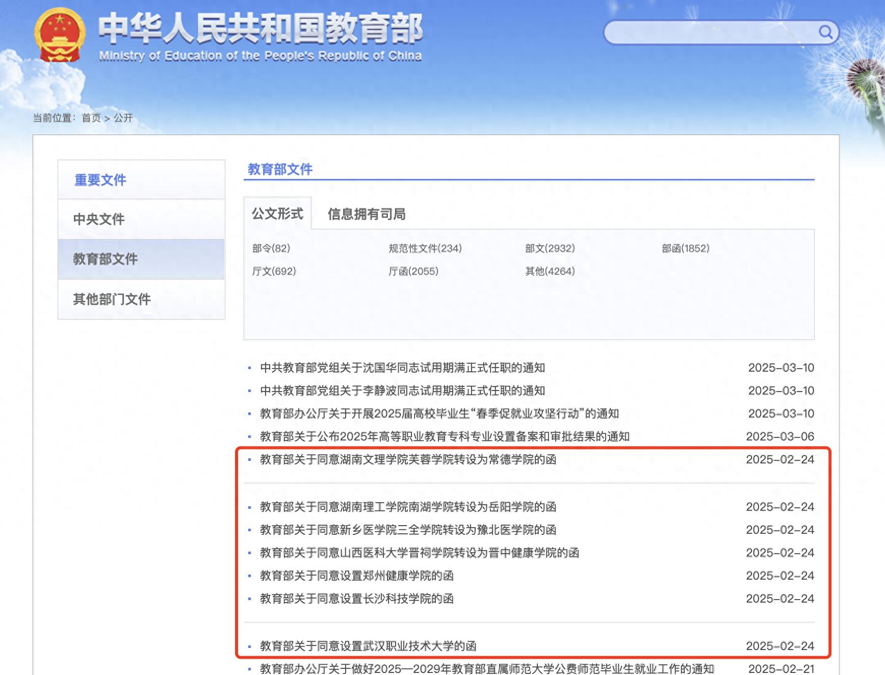 近日,教育部官網發布一批同意設置新大學的函,同意湖南文理學院芙蓉學院轉設為常德學院,湖南理工學院南湖學院轉設為岳陽學院,新鄉醫學院三全學院轉設為豫北醫學院,山西醫科大學晉祠學院轉設為晉中健康學院,設置鄭州健康學院,設置長沙科技學院,設置武漢職業技術大學。