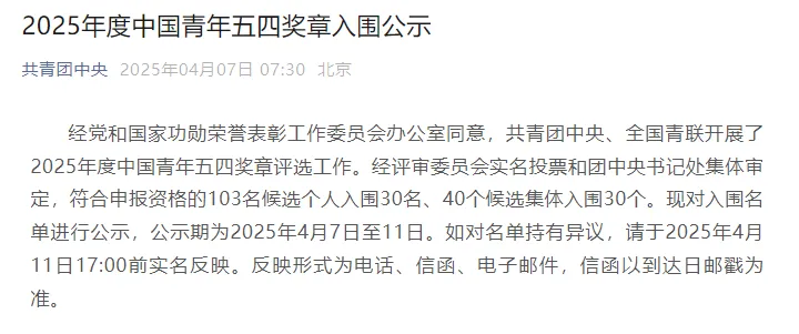 經黨和國家功勛榮譽表彰工作委員會辦公室同意,共青團中央、全國青聯開展了2025年度中國青年五四獎章評選工作。經評審委員會實名投票和團中央書記處集體審定,符合申報資格的103名候選個人入圍30名、40個候選集體入圍30個