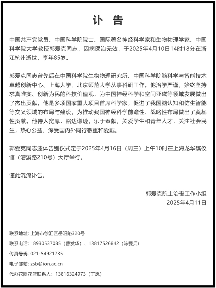 中國科學院腦科學與智能技術卓越創新中心微信公眾號11日發布訃告:中國共產黨黨員、中國科學院院士、國際著名神經科學家和生物物理學家、中國科學院大學教授郭愛克同志,因病醫治無效,于2025年4月10日14時18分在浙江杭州逝世,享年85歲。