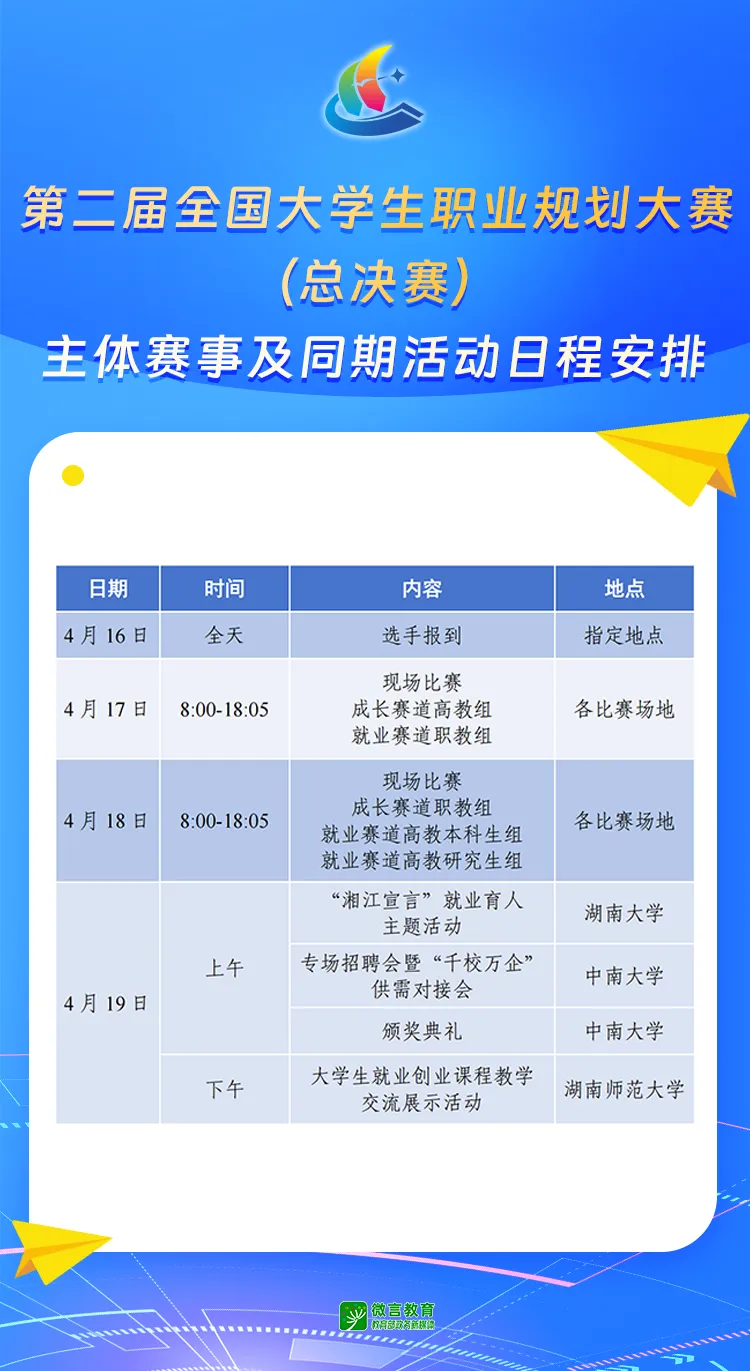 第二屆全國大學生職業規劃大賽總決賽將于4月16日至19日在湖南省長沙市舉辦。