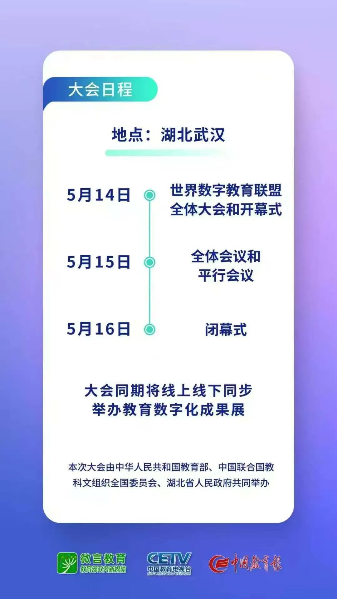 官網顯示,5月14日將舉行世界數字教育聯盟全體大會和開幕式,15日舉行全體會議和平行會議,16日舉行閉幕式。大會同期將線上線下同步舉辦教育數字化成果展。