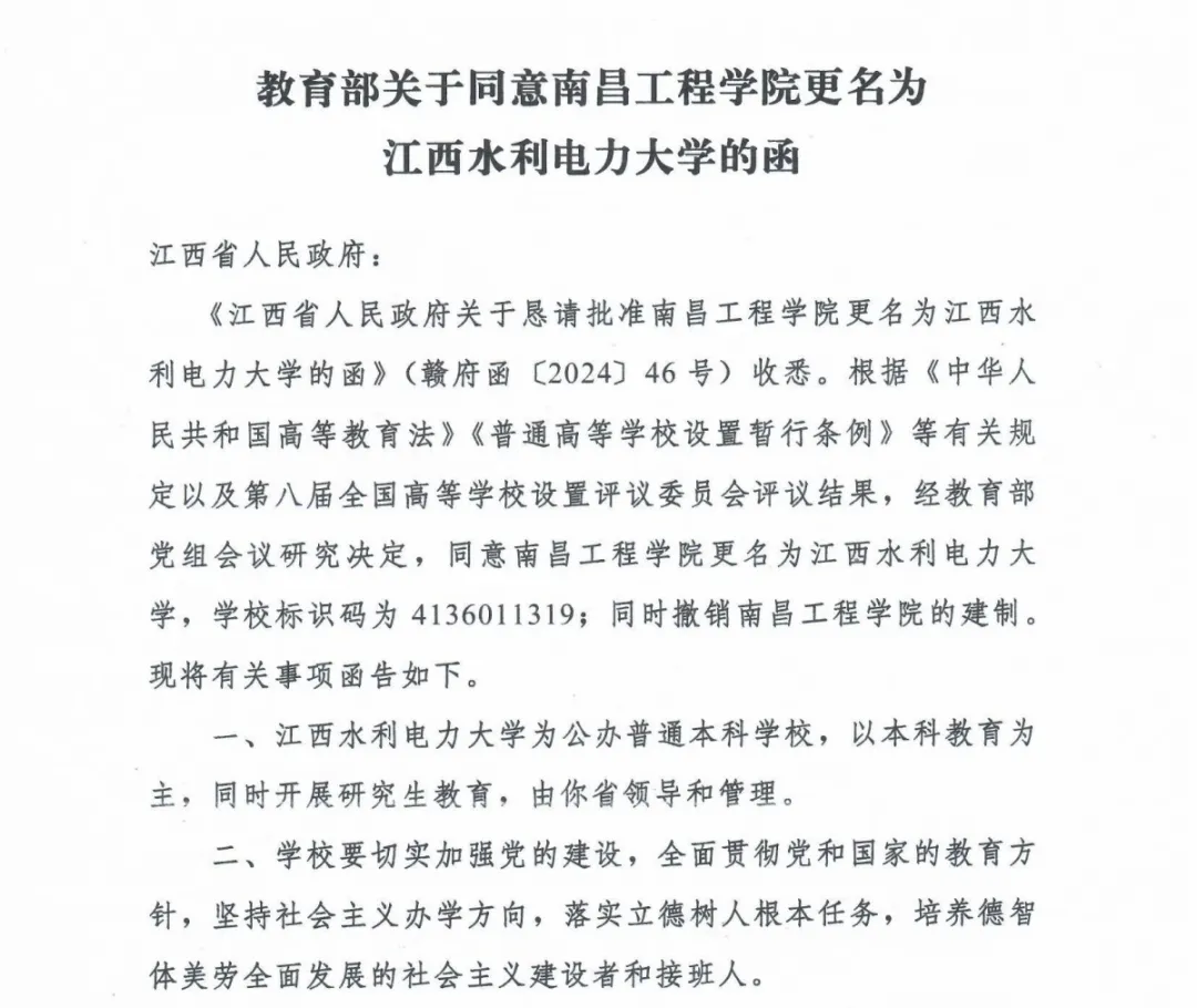 近日,教育部向江西省人民政府發送《教育部關于同意南昌工程學院更名為江西水利電力大學的函》,經教育部黨組會議研究決定,同意南昌工程學院更名為江西水利電力大學