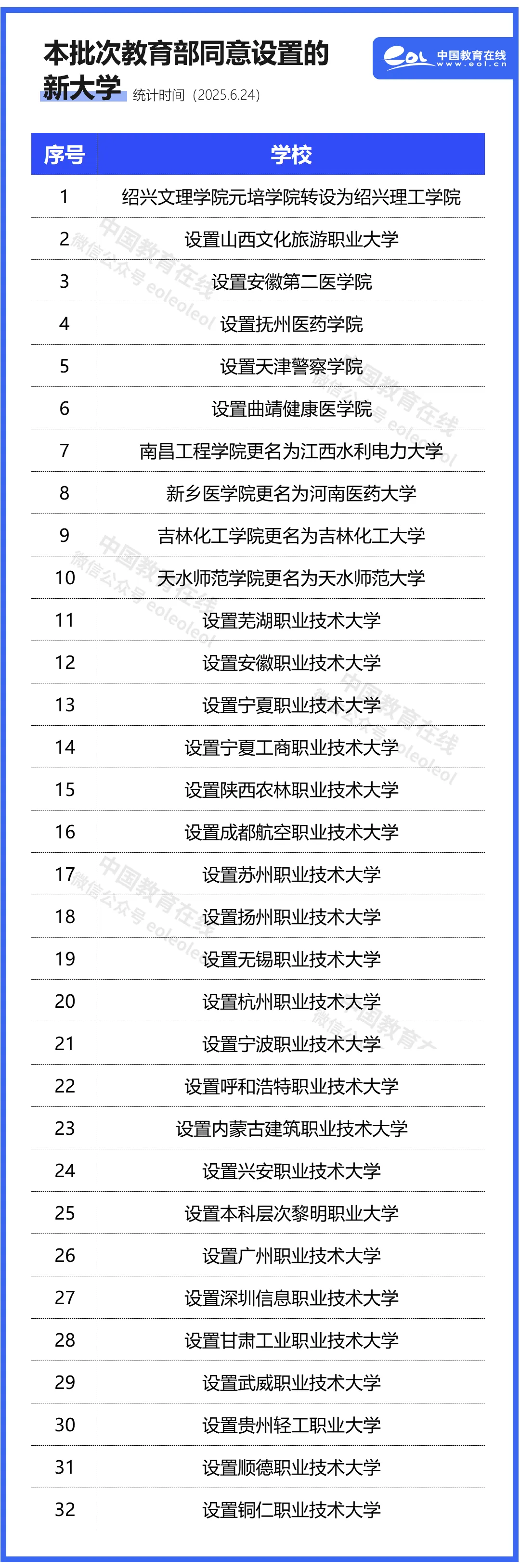 經梳理,此次同意設置的32所高校均為本科院校。其中:新設院校27所(包含23所職業本科院校)、獨立學院轉設高校1所、學校更名4所。