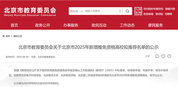 8月4日,北京市教委發布《關于北京市2025年新增推免資格高校擬推薦名單的公示》,擬推薦北京電子科技學院、北京聯合大學、北京物資學院、北京第二外國語學院4所高校為北京市2025年新增推免資格高校。