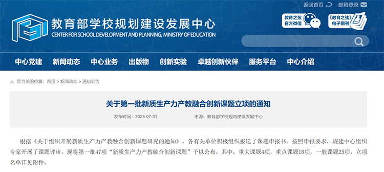 近日,教育部學校規劃建設發展中心發布《關于第一批新質生產力產教融合創新課題立項的通知》。