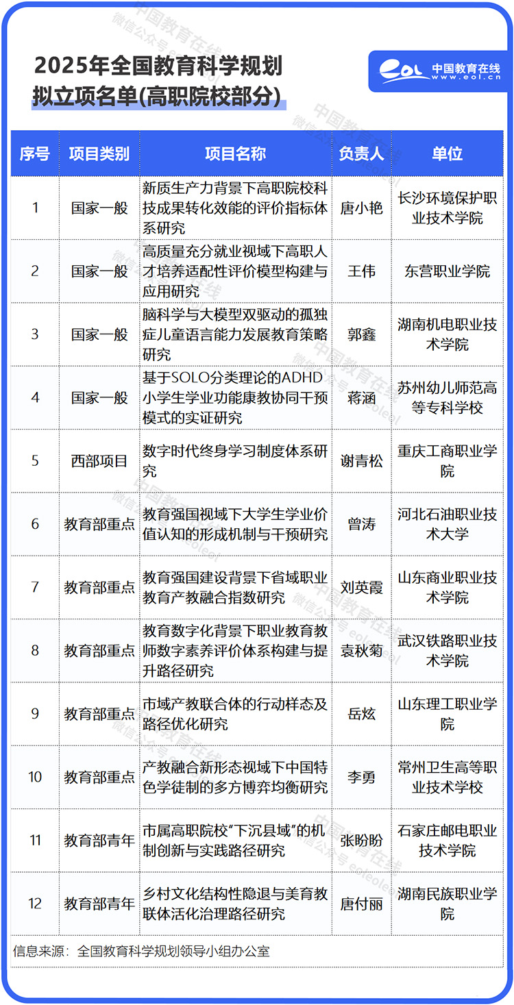 8月5日,全國教育科學規劃領導小組辦公室發布《2025年度全國教育科學規劃擬立項名單公示》。共540項個項目擬獲立項資助,其中包括12所高職院校申報的12個項目。