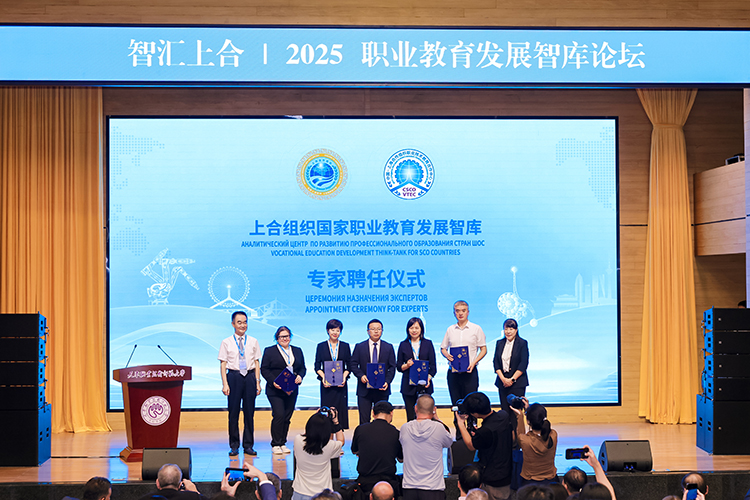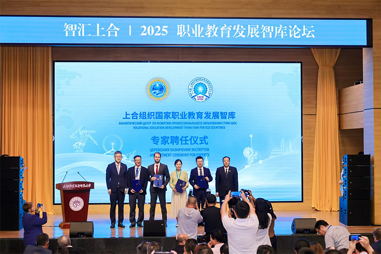 上合組織國家職業教育發展智庫專家聘任環節,中國教育部課程教材研究所副所長曾天山,天津教育委員會副主任羅延安,天津職業技術師范大學校務委員會主席張金剛,天津職業技術師范大學校長鄭清春,中國教育部魯班工坊建設專家委員會主任呂景泉,天津職業技術師范大學黨委副書記李靖為智庫專家頒發聘書。