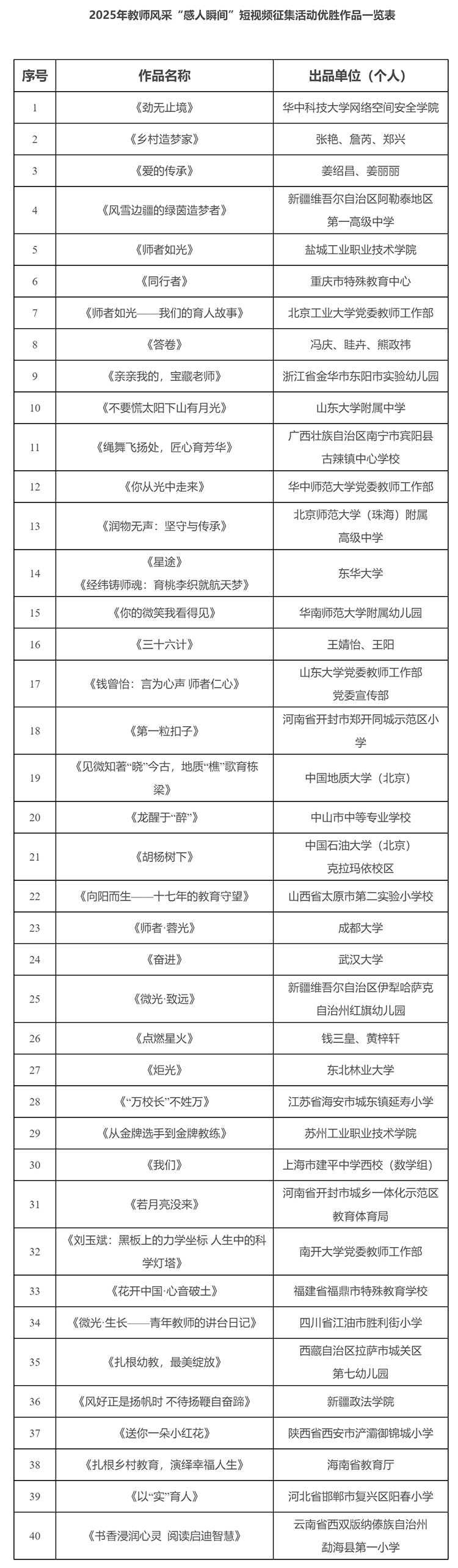 2025年教師風采“感人瞬間”短視頻征集活動優勝作品和入圍作品名單