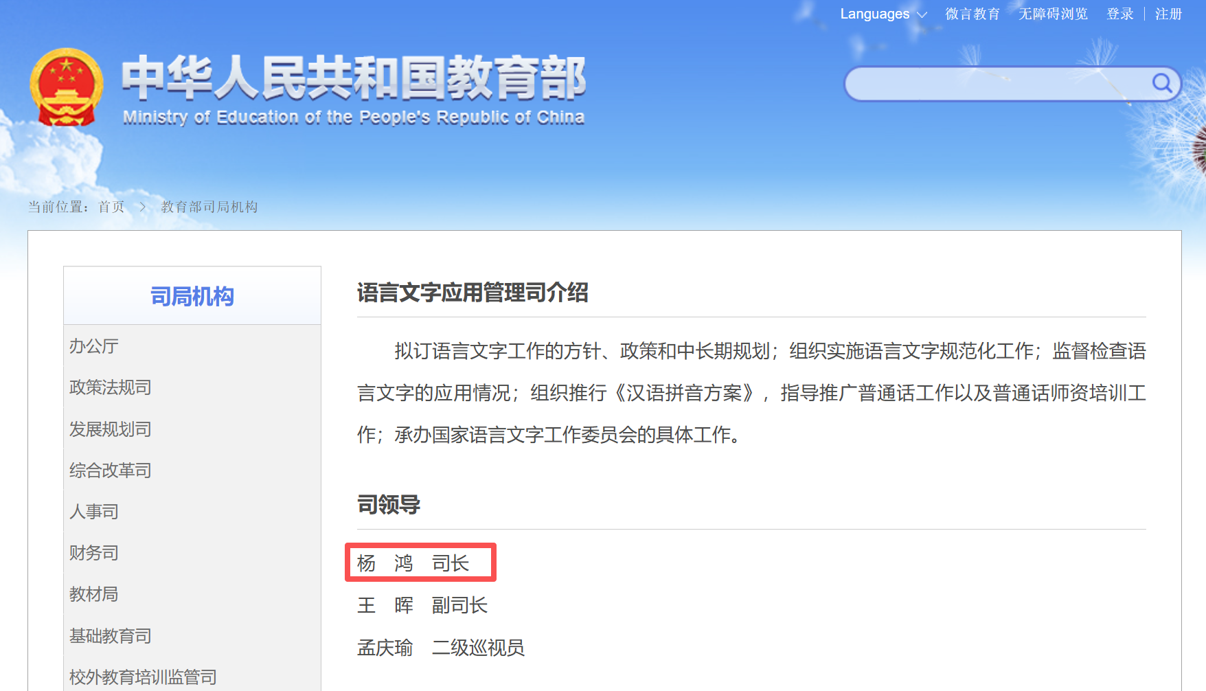 近日,教育部官網顯示,楊鴻已任教育部語言文字應用管理司司長。